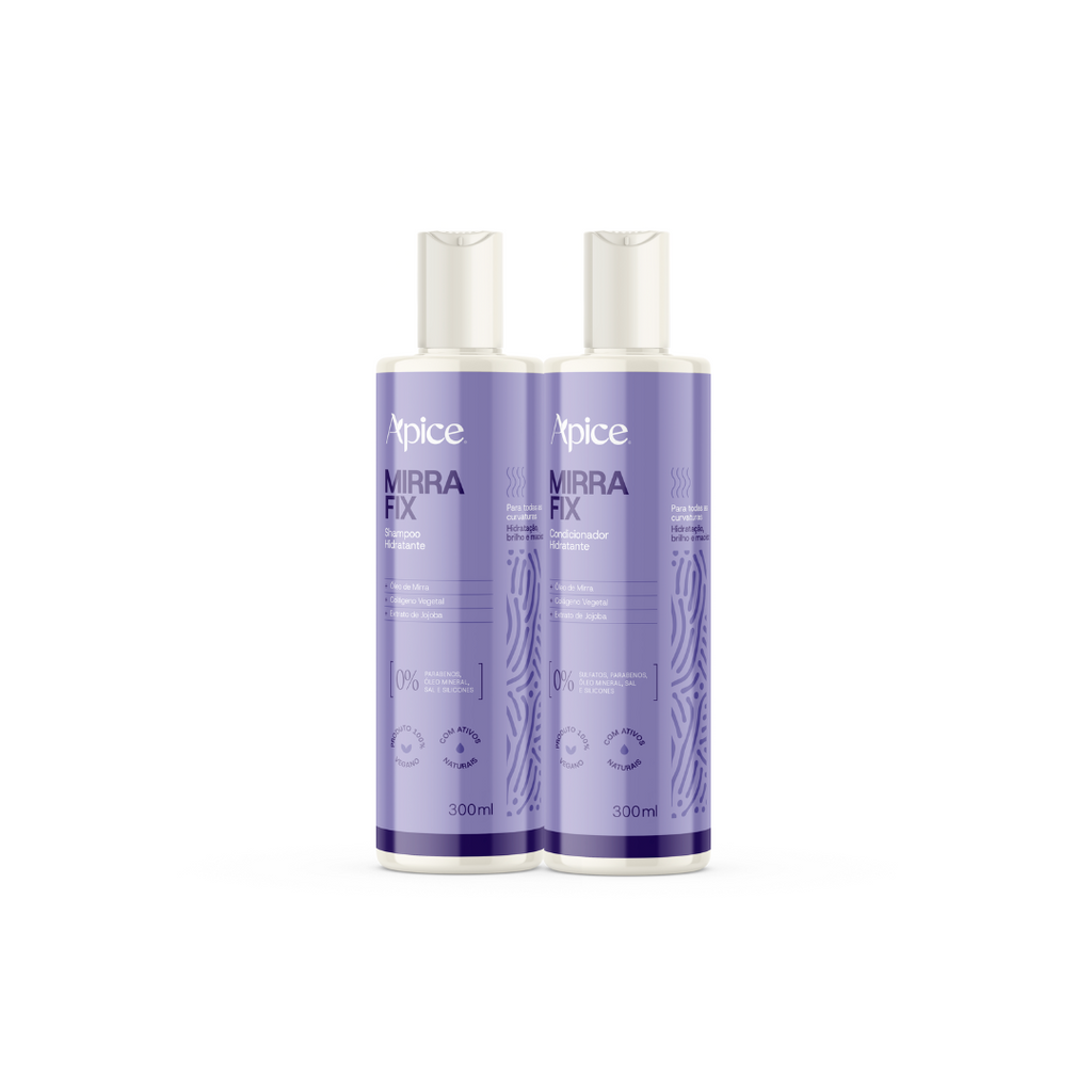 Kit Linha Mirra Fix contém: Shampoo Hidratante 300ml e Condicionador Hidrante 300 ml.